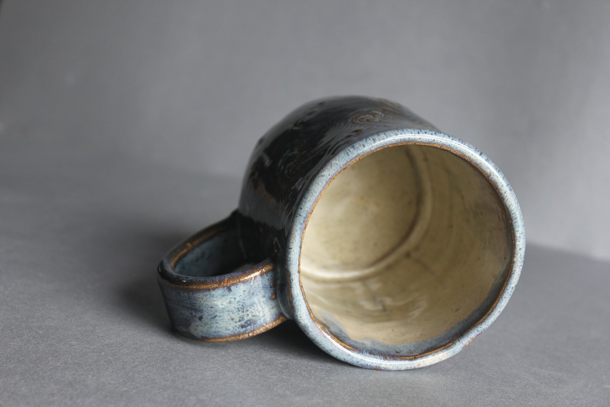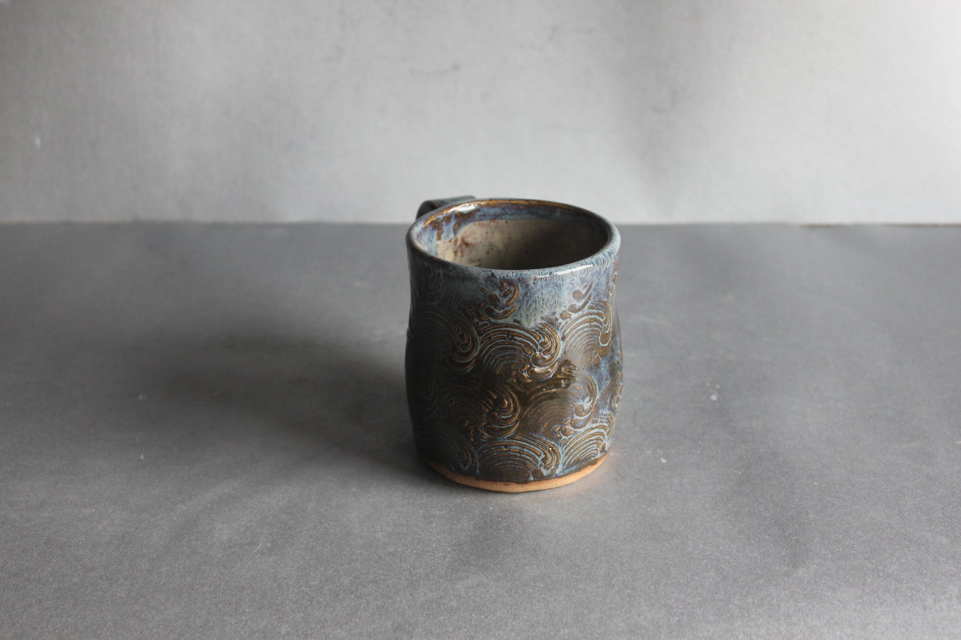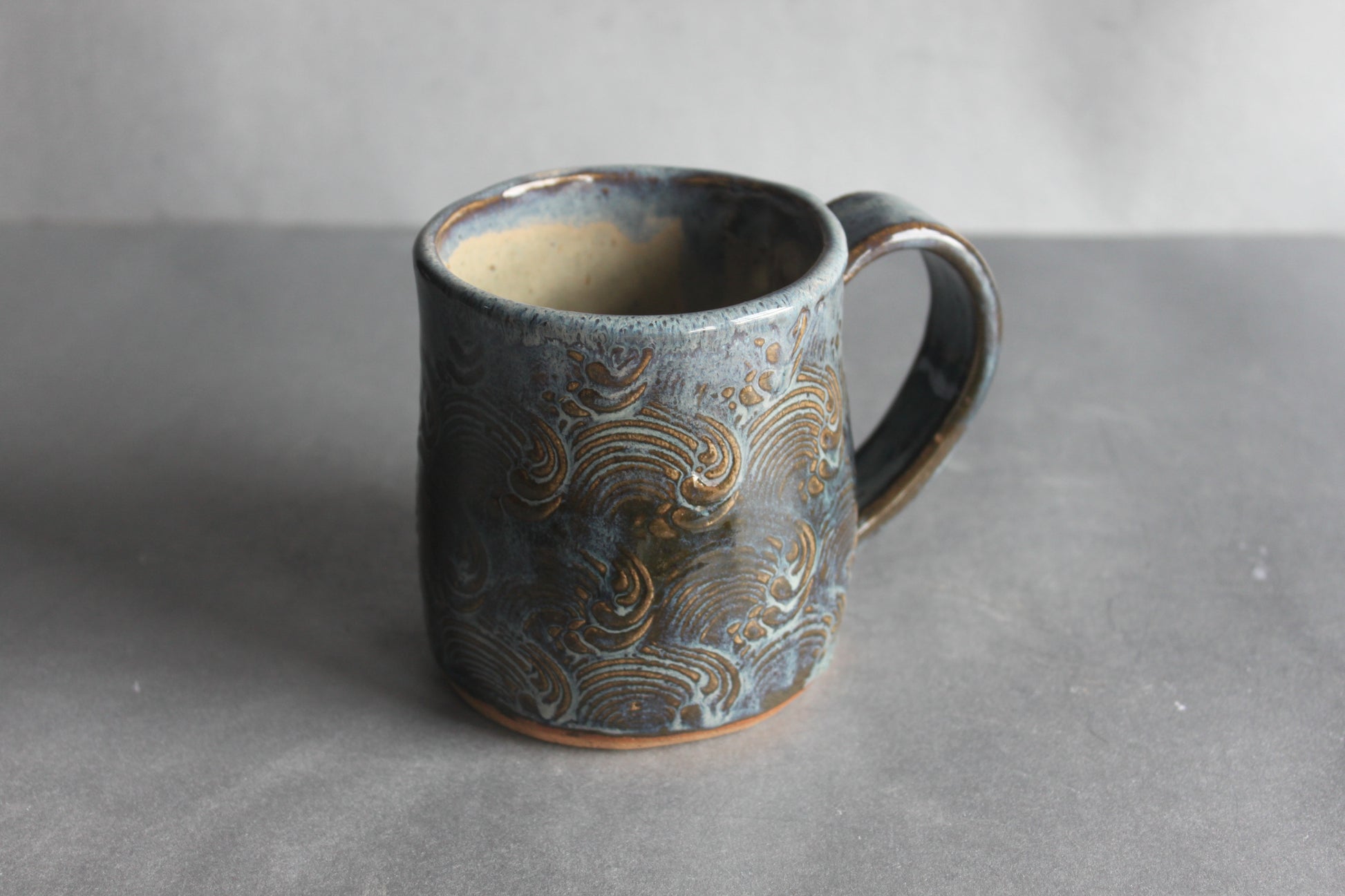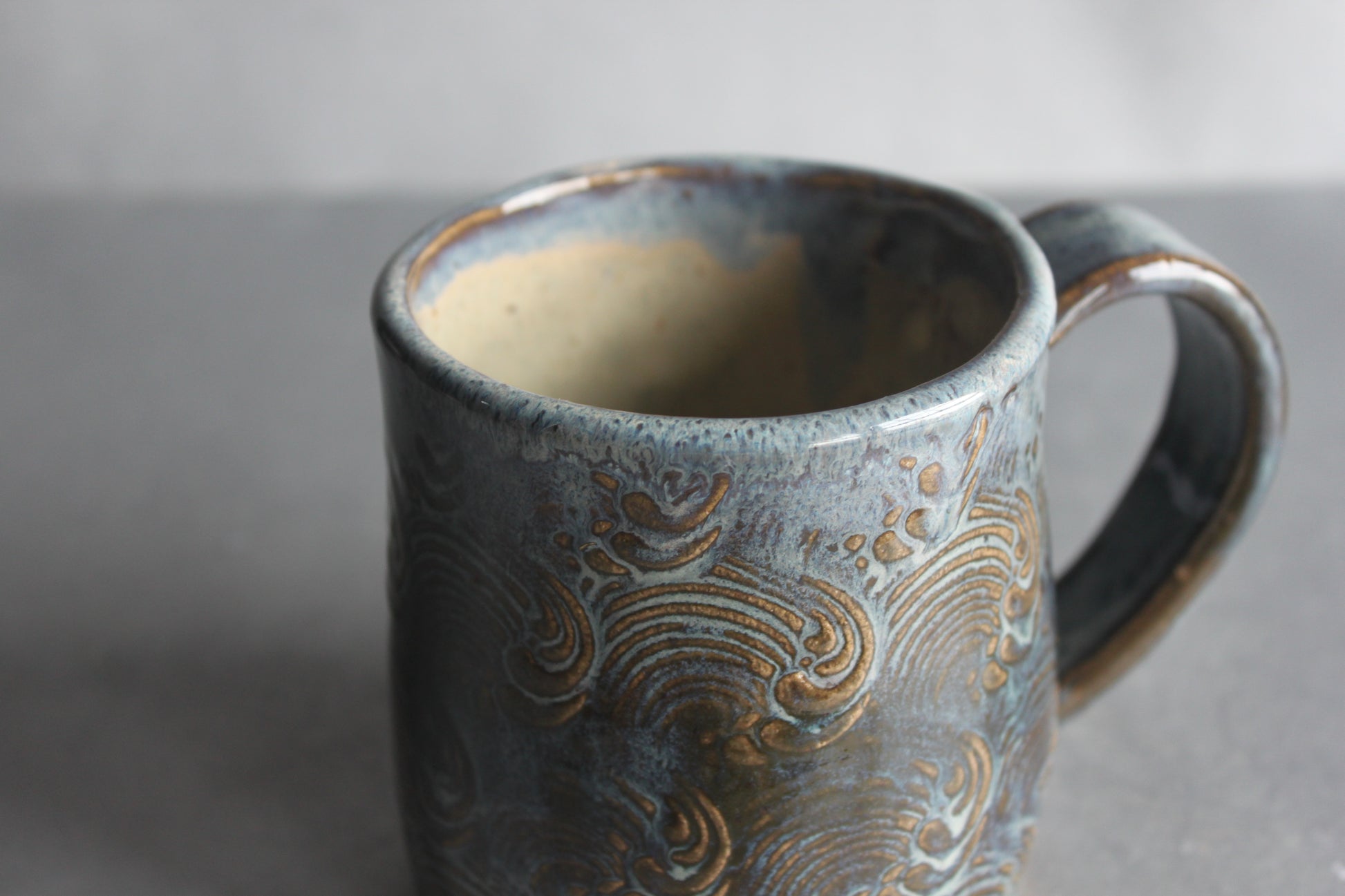 Enjoy your coffee, tea, hot chocolate, or favorite beverage in a hand-painted slab-built ceramic wave mug. This glaze gives you elements of the sea: blue wave exterior pattern with sandy interior.