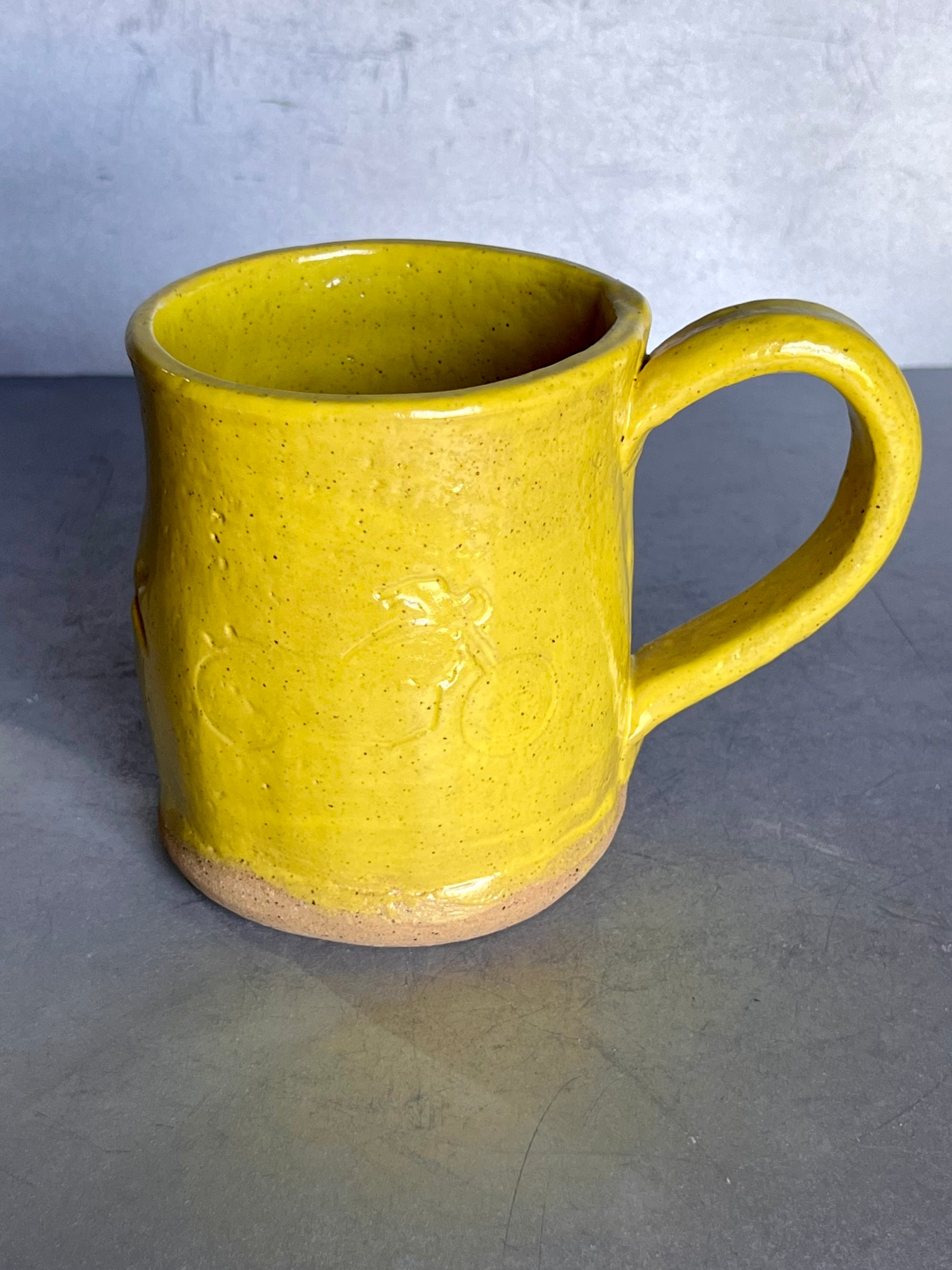 Enjoy your coffee, tea, hot chocolate, or your favorite beverage in a handmade and hand-painted yellow motorcycle mug.